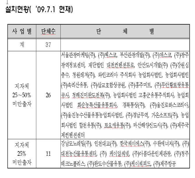 행정안전부로부터 출자지분 회수 및 매각을 권고받은 지방자치단체는 충북 영동군(와인코리아(주) 출자), 경기 안산시(안산도시개발(주) 출자), 서울 강남구(강남모노레일(주) 출자), 경기 광명시((주)케이알씨넷 출자), 충남 홍성군((주)홍주미트 출자) 등 5개 지방자치단체이며 경북통상(주)에 출자한 경북도는 3년 내에 자본잠식상태를 해소하되, 자본잠식상태를 해소하지 못할 경우 투자지분을 회수하도록 경영개선을 권고 받았다.