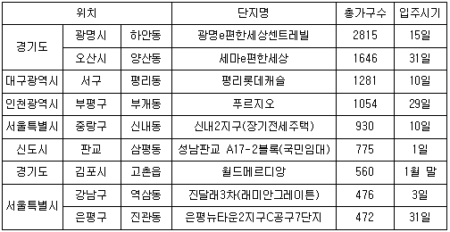 다음으로는 오산시 양산동에 세마e편한세상으로 1646가구 규모다. 지방에서는 대구광역시 서구 평리롯데캐슬이 1281가구로 규모가 가장 크다.