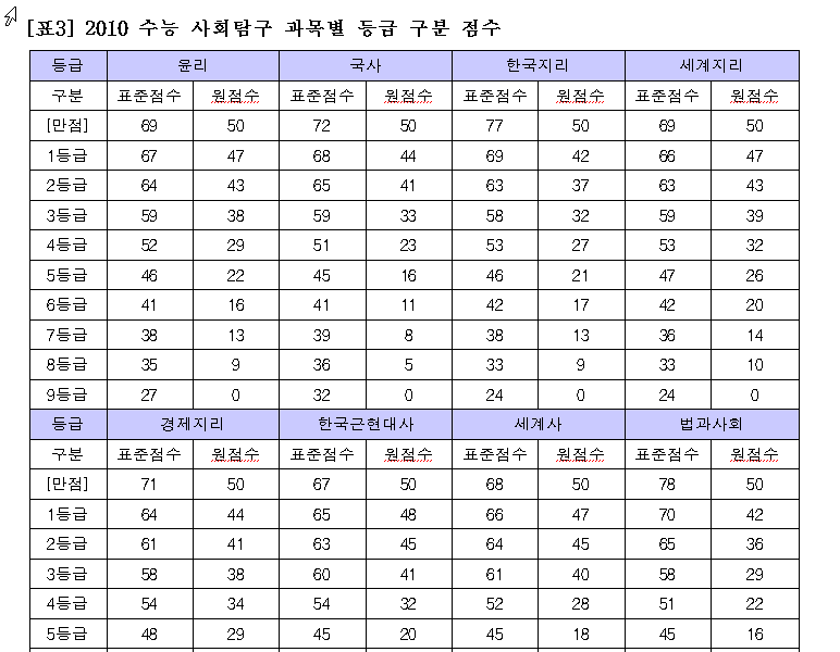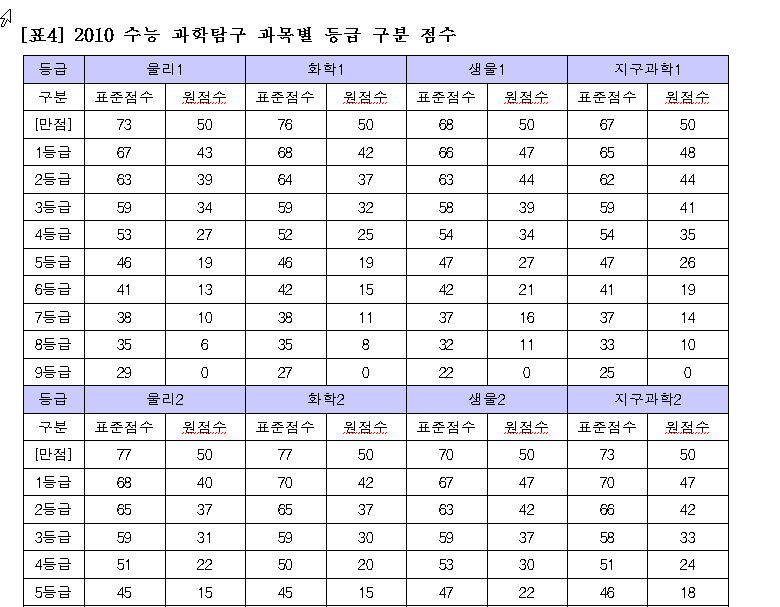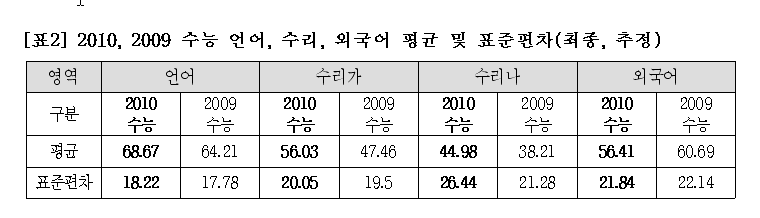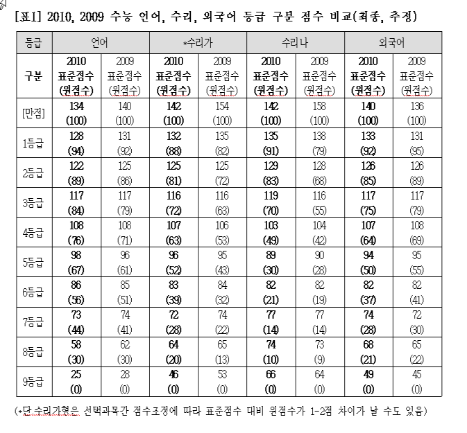 [프라임경제]2010학년도 수능 성적 최종 결과에 따르면, 수리 영역이 예상대로 대폭 쉽게 나와 만점자 표준점수가 수리가, 나형 모두 142점으로 작년도 154점, 158점과 비교하여 가형은 12점, 나형은 16점 대폭 하락하였다. 1등급 구분 표준점수도 수리가형 132점, 수리나형 135점으로 작년도보다 3점 각각 하락하였다.