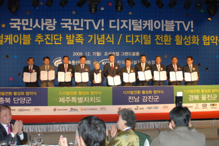 한국케이블TV방송협회(회장 길종섭)는 7일 오전 11시 조선호텔 그랜드볼룸에서 최시중 방송통신위원장, 고흥길 국회 문화체육관광방송통신위원장, 양조훈 제주특별자치도 부지사를 비롯한 4개 디지털전환 시범지역 지자체장, 케이블업계 관계자 등 100여명이 참석한 가운데 디지털케이블추진단(단장 이화동)을 구성하고, 디지털방송 전환 활성화를 위해 방송통신위원회 및 지방자치단체와 협약을 체결했다.