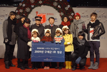 [프라임경제]파리바게뜨가 7일, 명동 신세계 백화점 맞은편 분수대 광장에서 진행한 ‘구세군 성금 전달식’에서 (좌측부터)구세군 대한본영 유성자 총재, 전광표 사령관과 파리바게뜨 최석원 대표이사, 2PM, 어린이들이 성금을 들고 있다.