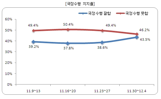 여론조사 전문기관 리얼미터(대표 이택수)가 12월 첫주 가구전화와 휴대전화로 실시한 정례 여론조사 결과, 이 대통령의 지지율은 전주 대비 4.9%p 상승한 43.5%로 나타났으며, 국정수행을 잘못하고 있다는 부정평가는 46.2%p를 기록했다.