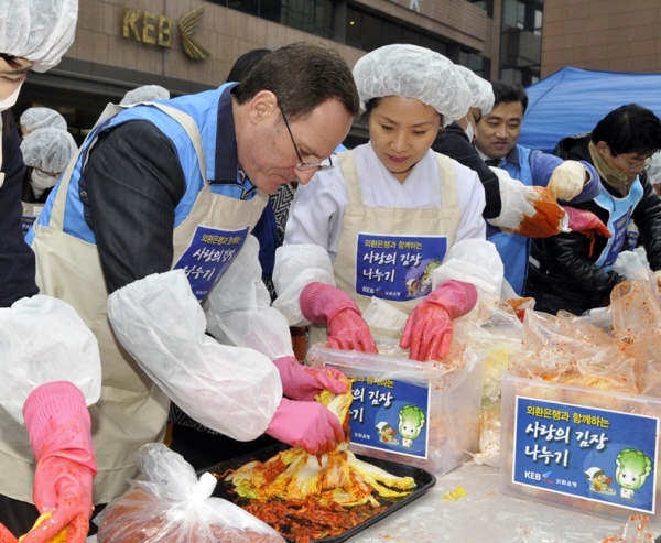 매년 실시해오고 있는 사랑의 김장나누기 행사는 외환은행 임직원들이 직접참여해 담군 김치를 불우이웃들에게 전달하는 행사로 나눔을 통해 사회적 책임을 다하기 위해 마련됐다.