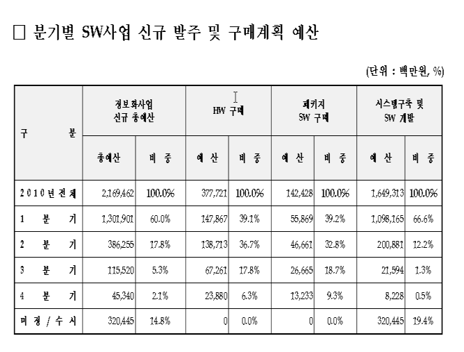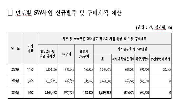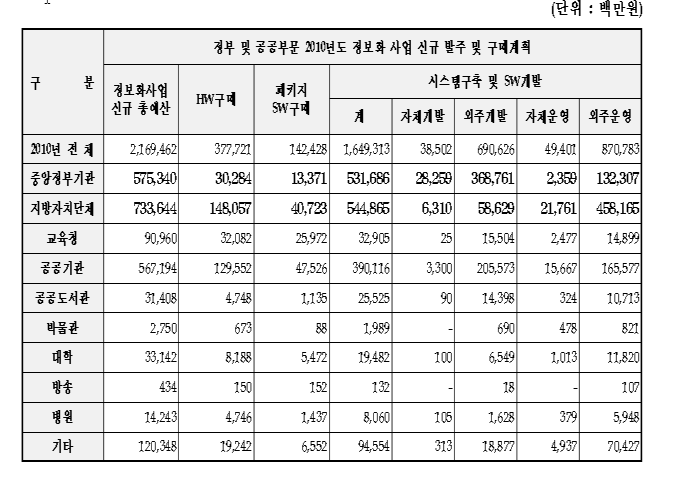 조사결과에 따르면, 2010년도 공공분야 SW사업규모는 2조1,694억원으로서 2009년 대비 약 7.4% 증가한 것으로 나타났다. 이 중 HW 구매는 3,777억원, 패키지SW 구매는 1,424억원, 정보시스템구축 및 SW개발 예산은 1조 6,493억원으로 조사됐다.
