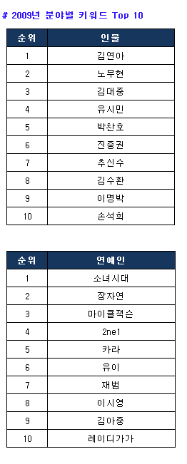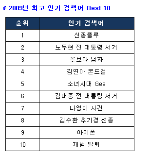 올 해는 유난히 정치∙종교계 유명인사들이 세상을 떠나면서 전국을 안타까움과 충격으로 몰아넣기도 했다. 지난 5월 온 국민을 슬픔에 빠뜨렸던 ‘노무현 전 대통령 서거’가 검색어 순위 2위에 올랐으며, 뒤이어 ‘김대중 전 대통령’, ‘김수환 추기경 선종’이 각각 6위, 8위에 올랐다.
