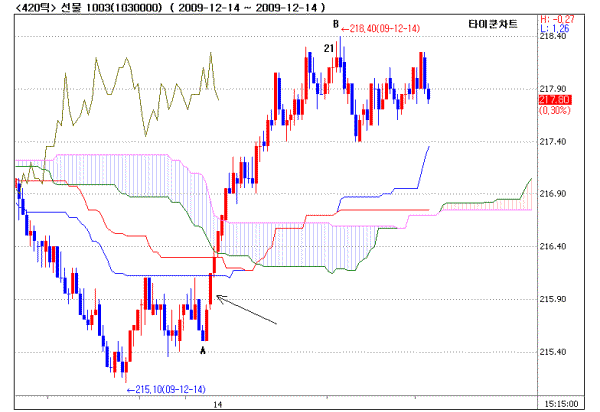 위 <그림1>은 코스피 선물 240틱 타이쿤차트이다. A바닥 양봉에 비해 두번째 양봉이매우 큰 것이 특징이다. 이는 시장이 A바닥을 기점으로 추세가 반전될 가능성에 심리적으로 경사된 것을 의미한다. A바닥에서 B위치까지 33개의 양봉으로 천정이다. 이는 타이쿤수열 34에 해당하는 것이다.
