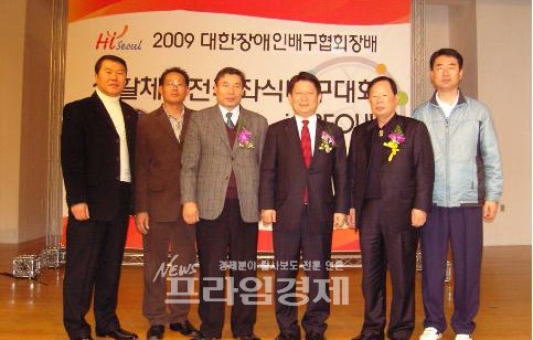 | ▲2009 대한장애인배구협회장배 생활체육전국좌식배구대회 IN SEOUL에서 권영진 회장과 호남지역 배구인들이 기념촬영을 하고 있다. 좌측부터 전갑수 부회장, 김병승 전무이사, 김용태 광주시장애인배구협회장, 권영진 회장, 이길도 광주시장애인체육회 상임부회장. |