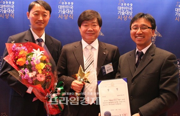 | ▲ SK케미칼 생명과학연구소 엄기안 신약연구실장(가운데)이 대한민국 기술대상에서 지식경제부 장관상을 수상한 뒤 프로젝트를 수행한 제제팀원들과 미소를 지으며 포즈를 취하고 있다. |