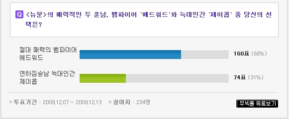 ‘<뉴문>의 매력적인 두 훈남, 뱀파이어 ‘에드워드’와 늑대인간 ‘제이콥’ 중 당신의 선택은?’이라는 질문에 총 234명의 참가자 중 68%에 해당하는 160명이 절대 매력의 뱀파이어 에드워드를 지목한 것.