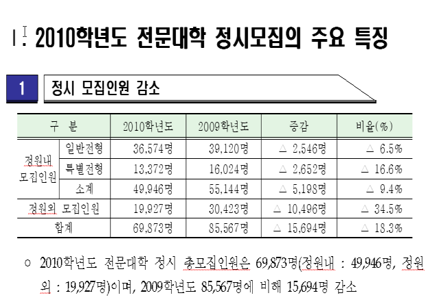 2010학년도 정시 총 모집인원은 69,873명으로 전년도(85,567명) 보다 15,694명 감소하였다.