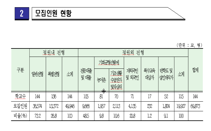 정원외 특별전형으로는 115개교에서 19,927명을 모집하며, 이 중 48.5%에 해당하는 9,666명을 전문대학 및 대학 졸업자 전형으로 모집한다. 수능성적 반영시 백분위를 활용하는 대학이 72개교, 표준점수를 활용하는 대학이 30개교, 등급을 활용하는 대학이 29개교이다.