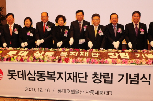 | <사진설명= 왼쪽부터 강길부 울주군 국회의원, 윤명희 울산시의회 의장, 노신영 롯데장학ㆍ복지재단 이사장, 신영자 롯데삼동복지재단 이사장, 신동빈 롯데그룹 부회장, 박맹우 울산시장, 최병국 울산시 국회의원, 김상만 울산교육청 교육감> | ||