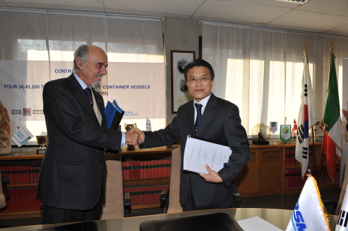 | <사진설명= 메시나 이사회 의장인 Mr. Paolo Messina씨와 대우조선해양 황태진 전무가 계약서명후 계약서를 교환하고 있다> | ||