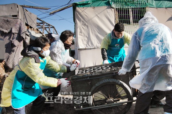 | < GS칼택스 임직원들이 16일 구룡마을 방문해 연탄배달 봉사활동을 펼치고 있다.> | ||