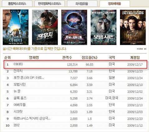 개봉 전날임에도 불구하고 <아바타>는 영화에 쏟아진 관객들의 폭발적인 인기를 증명하며 하루만에 7만7800명의 관객을 동원해 극장가와 관객들을 놀라게 하고 있다.
