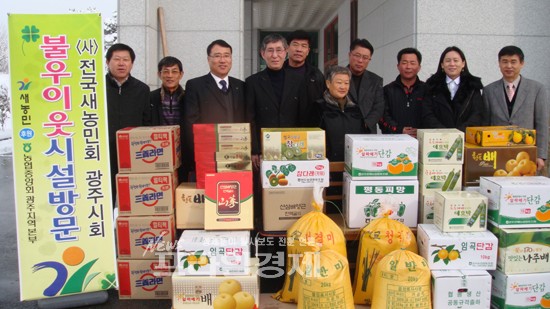[프라임경제]농협광주지역본부(본부장 정종순)는 21일 (사)전국새농민회 광주시회 (회장 정영두) 회원들과 함께 광산구 덕림동에 위치한‘명은 노인전문요양원’을 방문, 새농민 회원들이 직접 가꾼 농산물을 전달하는 등 나눔경영 실천에 적극 앞장서고 있다.