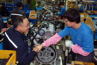 쌍용자동차는 노사 화합 및 기업회생 다짐을 위해 실시하고 있는 '노사 한마음 나누기 운동'의 일환인 인사나누기 및 현장 경영활동을 22일 창원 엔진공장(경남 창원 소재)에서 가졌다고 밝혔다.