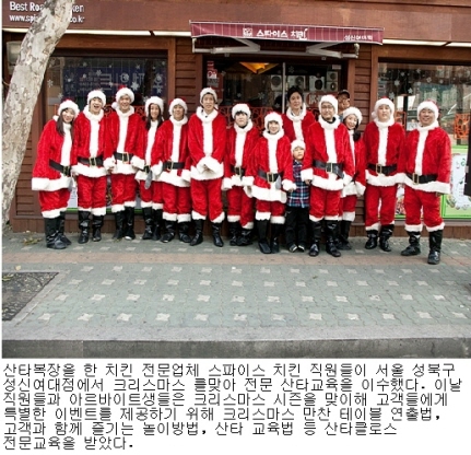 [프라임경제]스파이스치킨(대표 최창수)은 멋진 크리스마스만찬 테이블연출법, 고객과 함께 즐기는 크리스마스 놀이방법, 성대모사와 등 산타 교육법과 크리스마스 시즌 고객 접대방법을 배우기 위해 산타아카데미(원장 박경덕)와 업무 협약식을 맺었다.