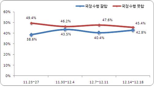 여론조사 전문기관 리얼미터(대표 이택수)가 12월 14일~12월 18일 5일간 가구전화와 휴대전화로 실시한 정례 여론조사 결과, 이 대통령의 지지율은 전주 대비 2.4%p 상승한 42.8%로 나타났으며, 국정수행을 잘못하고 있다는 부정평가는 45.4%p를 기록했다.