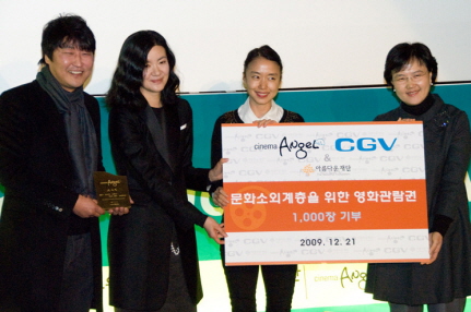 [프라임경제]CJ CGV가 전도연과 손잡고 문화소외계층의 영화관람권 조성에 발 벗고 나섰다. 21일 CGV압구정에서 진행된 ‘2009 디렉터스 컷 시상식’(2009 Director’s CUT Awards)에서 CJ CGV 마케팅본부 박정애 상무와 배우 전도연이 참석하여 아름다운 재단 박정숙 상임이사에게 영화관람권 1000장을 직접 전달한 것. ‘시네마엔젤 프로젝트’는 2007년 이현승 감독의 제의로 시작된 영화배우들의 문화 도네이션 모임으로, 영화를 통한 문화소외계층의 문화향유 및 독립영화 발전을 목적으로 설립되었다.