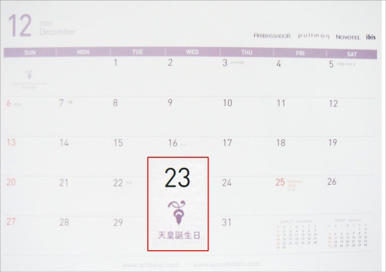앰배서더 호텔 그룹에서 제작·발송한 2010년 달력에는 일본의 국경일과 각종 기념일들이 일본 현지와 동일한 형태로 만들어 졌으며, 우리나라의 국경일과 기념일도 함께 혼재되어 있는 특이한 형태를 띄고 있다.