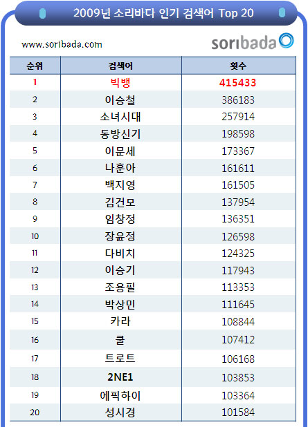 올 한해 네티즌들이 가장 많이 찾은 음악 관련 검색어에는 41만5000건을 기록한 ‘빅뱅’이 차지했다. 2위에는 38만6000천건 이상의 검색횟수를 기록한 이승철이 선정됐고, 3위에는 25만7000건 이상의 소녀시대가 그 뒤를 이었다.