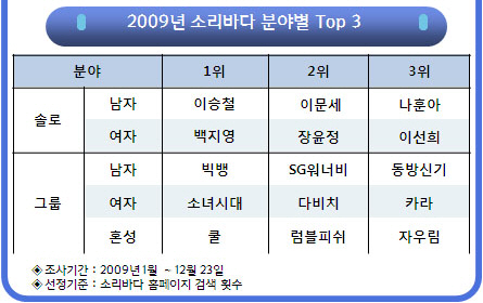 각 분야별 1위도 함께 발표했다. 남자 솔로 가수에는 최고 가창력을 자랑하는 이승철이 차지했으며, 여자 솔로 가수에는 올해 다양한 활동을 보인 발라드의 여왕 백지영이 선정됐다. 소녀시대는 여성 그룹 1위와 동시에 Gee가 가장 많이 찾은 노래로 선정되어 올해 최고의 여성그룹의 면모를 과시했다.