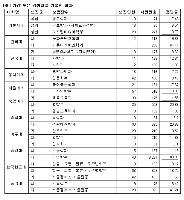 숙명여대의 경우 가군은 3.97대1, 올해 새롭게 진입한 나군의 경우 16.42대1의 높은 경쟁률을 보였다. 특히 나군의 경우 경영학부, 생명과학부 등 선호도가 높은 모집단위에서만 수험생을 선발하게 되어 나군의 경쟁률이 매우 높게 나타났다.