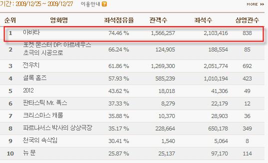 [프라임경제] 최단기간 430만 관객을 돌파하며 흥행 몰이를 하고 있는 <아바타>는 영화진흥위원회의 통합전산망에 기준, 크리스마스 휴일인 지난 25일부터 27일 동안 74.46%라는 높은 좌석 점유율을 기록해 2009년 박스오피스 1위에 오른 영화 중 최고치를 보이고 있다.