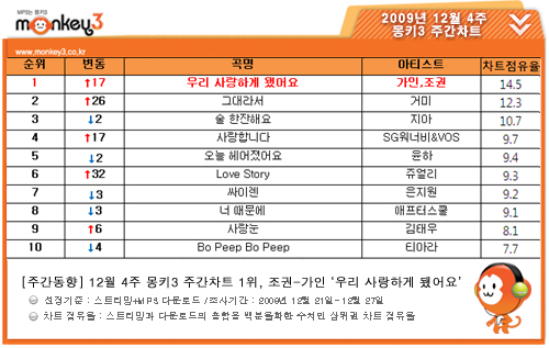 음악전문사이트 몽키3(www.monkey3.co.kr)가 발표한 12월 넷째 주(12월 21일~27일) 주간차트 1위는 조권(2AM)과 가인(브아걸)의 듀엣곡 ‘우리 사랑하게 됐어요’가 차지했다.