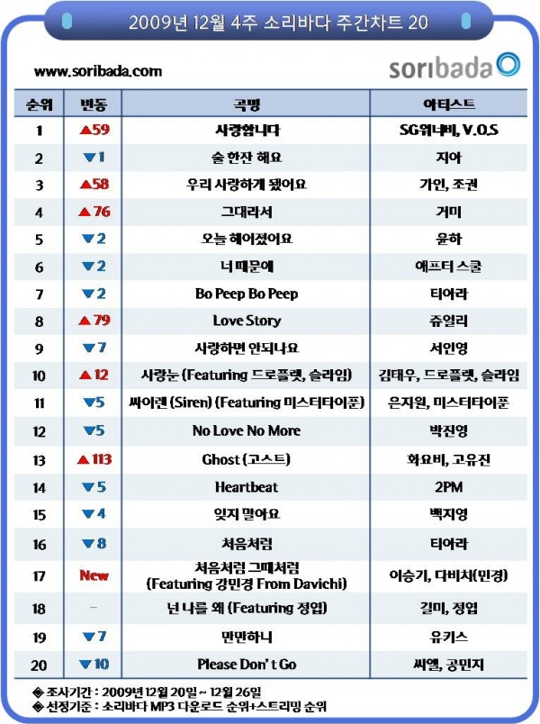 12월 4주차(12월 20일~12월 26일) 소리바다(대표 양정환) 차트에서는 SG워너비의 김용준, 이석훈과 V.O.S의 최현준, 김경록의 감미로운 목소리에 사랑하는 여성에 대한 애절한 가사가 어우러진 ‘사랑합니다’가 59계단 상승하며 정상을 차지했다.