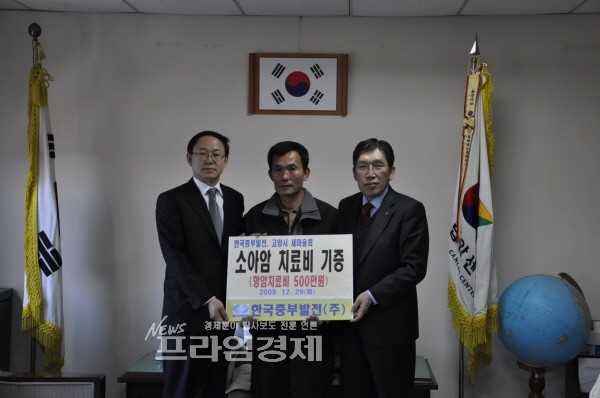 한국중부발전 서울화력발전소 박형구 소장(왼쪽)과 국립암센터 이진수 병원장(오른쪽)이 29일 암투병중인 신현지(가명, 19)양 아버지 신점철씨에게 기부금을 전달하고 있다.