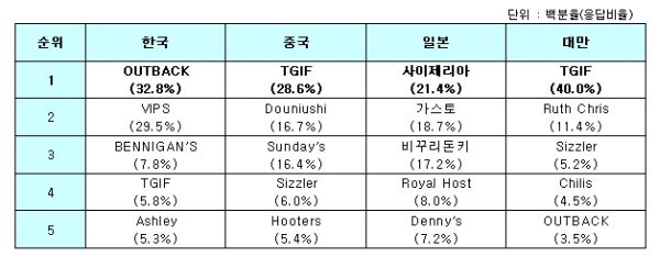 즉, 한국의 소비자들은 ‘아웃백(OUTBACK)’을 가장 선호하였고(32.8%), 중국과 대만은 ‘티지아이에프(TGIF)’의 선호도가 가장 높게 나타났다(각각 28.6%, 40.0%).