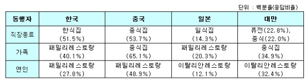 국가별 ‘함께 식사하는 사람’에 따라 선호하는 음식점에 대한 양상도 다르게 나타나고 있었는데, ‘직장동료’와 함께하는 경우는 ‘자국의 음식’에 대한 선호가 공통적으로 높았다.