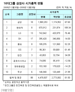 같은 기간 동안 코스피 지수는 종가 기준 1124.47에서 1672.48로 48.73%가 올라 10대그룹 상장사 시가총액이 코스피 상승률을 앞질렀다.