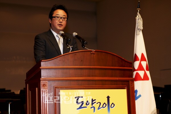 [프라임경제]4일 오후 코오롱그룹이 과천시민회관 대극장에서 시무식을 개최한 가운데 이웅열 회장이 신년 경영지침 ‘도약 2010’ 을 선포하며 신년사를 낭독하고 있다.