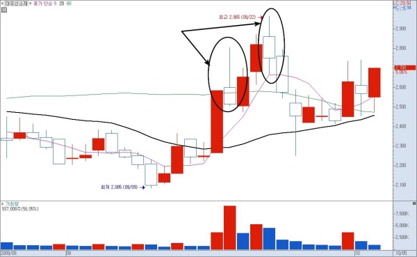 실제로 고점에서 장대양봉으로 연일 올라가던 주가가 고점에서 윗꼬리 달린 장대음봉이 탄생하고 나서부터 폭락하는 경우를 많이 보게 됩니다.