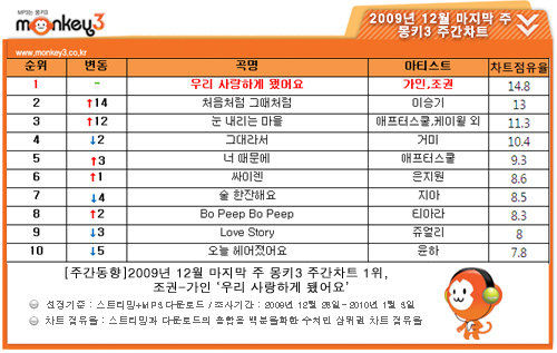 [프라임경제] 음악전문사이트 몽키3(www.monkey3.co.kr)의 2009년 12월 마지막 주(12월 28일~1월 3일) 주간차트는 인기 가수들이 결성한 프로젝트 그룹의 뜨거운 인기를 여실히 보여주고 있다.