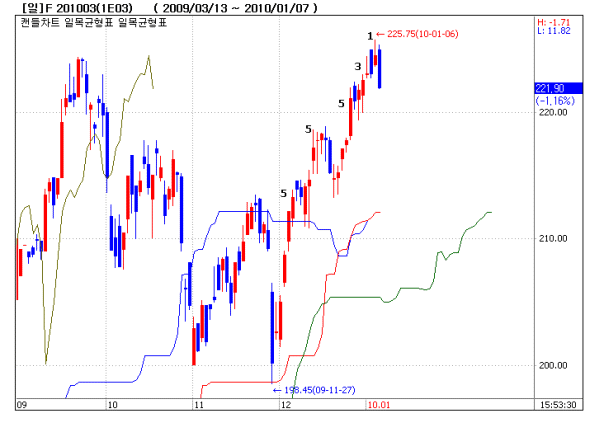 선물거래는 미래를 앞당겨서 하는 심리게임이다. 금일 시가 상승으로 10개의 양봉이 충족된 상태에서 종가까지 양봉이 유지되는 것이 불확실하다고 거래자들이 느낄 경우 시가 상승에 대부분의 매수포지션을 청산하게 되고 이는 주가 하락으로 유도된다. 선취 매도인 것이다..