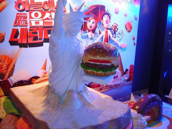 메가박스 코엑스에 또 한번 눈길을 사로잡는 깜짝 포토존이 등장했다. 바로 <하늘에서 음식이 내린다면>의 기발한 아이디어가 돋보이는 ‘거대 샌드위치 폭탄을 맞은 자유의 여신상’ 포토존이 바로 그것.