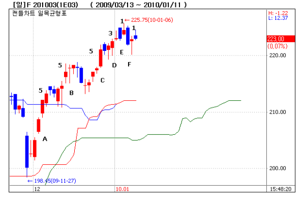 선물거래는 미래를 앞당겨서 하는 심리게임이다. 그런 의미에서 매도에는 선매도와 확인매도가 있다. 선매도는 9개의 양봉을 완성시킨 E 익일 상승 출발시 10개의 양봉이 완성된 상태에서 매도하여 종가 음봉을 만든 것이고 확인매도는 F에서 10개의 양봉을 확인하고 익일 매도하는 것이다.