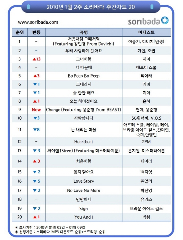 1월 둘째주는 여성 솔로가수들이 꾸준한 인기를 보인 한 주였다. 3위와 7위를 차지한 지아의 ‘그녀처럼’과 ‘술 한잔해요’를 비롯해 6위 거미의 ‘그대라서’, 8위 윤하의 ‘오늘 헤어졌어요’, 15위 백지영의 ‘잊지 말아요’ 등 여가수들의 애절한 발라드가 상위권을 차지했다.