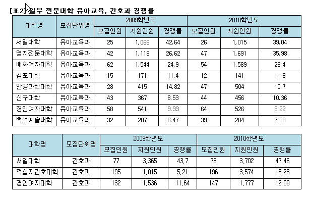 적십자간호대학의 경우 204명 모집에 3,860명이 지원하여 18.9:1 의 경쟁률을 보였는데, 이는 작년도 경쟁률 5.4:1에 비해 매우 큰 폭으로 상승한 것이다. 적십자간호대학의 경우 수능 4개 영역을 모두 반영하고 수능의 반영비율이 70%로 매우 까다로운 전형을 실시함에도 불구하고 경쟁률이 상승하였다. 이는 비교적 성적분포가 좋은 여학생들이 대거 지원한 것으로 짐작된다.
