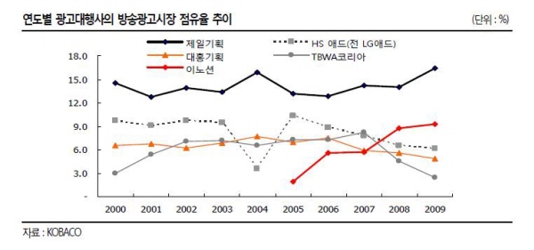 이 연구원은 “민영미디어렙과 관련하여 대형광고대행사에 상대적인 수혜가 있을 것으로 예상되며 이에 따라 1위사업자인 제일기획의 점유율도 확대될 가능성이 있다고 판단된다”고 전망했다.(아래 표 참조)