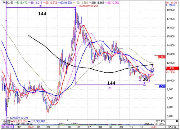 기술적 분석으로 본다면,지난 08월 10월부터 09년 5월까지 7개월 144일 상승이였으며,다시 재바닥을 보인 최근까지 대칭기간인 7개월 144일을 보였다.
