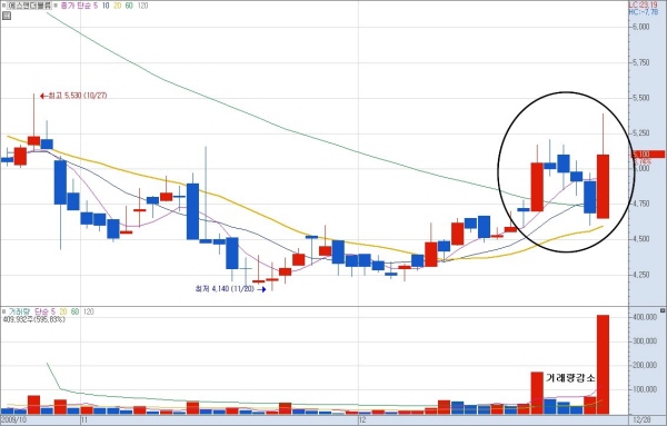 그런데 장대양봉 이후 주가가 연속 음봉으로 조정을 받을 때 거래량은 어떤가요. 줄어들고 있죠. 확실한 조정입니다. 이런 종목은 거래량이 늘어나면서 다시 주가가 양봉으로 상승해 줄 때 매수에 가담하면 됩니다.