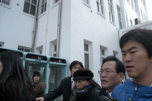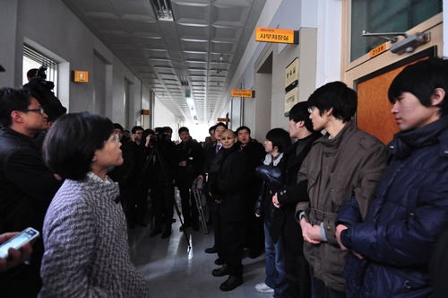 | ▲ 박성숙 이사(박철웅 전 이사장 장녀. 오른쪽에서 세 번째 모자쓴 이)가 15일 오전 조선대구성원들이 구경영진이 포함된 정이사회 해체를 주장하며 이사장실 앞 복도에서 농성을 전개하자 본관을 급히 빠져나오고 있다. 박 이사는 이날 사퇴입장을 밝혀달라는 학생들의 요구에 '침묵'으로 일관했다. ⓒ조대신문사 제공 |