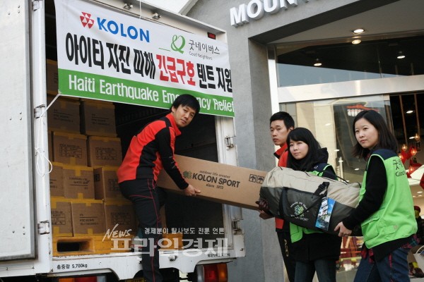 코오롱 관계자는 “국제사회의 관심과 지원으로 아이티 이재민들이 조금이라도 희망을 가졌으면 하는 마음에 대형 텐트 위주로 매장의 물량까지 급히 모았다”며 “굿네이버스 등 국제구호단체와 협력해 최대한 빨리 지원될 수 있도록 하겠다”고 말했다.