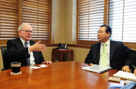 | <사진설명 = 포스코 정준양 회장이 세계적인 투자가인 워런 버핏 버크셔 해서웨이 회장을 19일 새벽(한국시간) 미국 네브래스카주 오마하 본사에서 면담하고 있다.> | ||