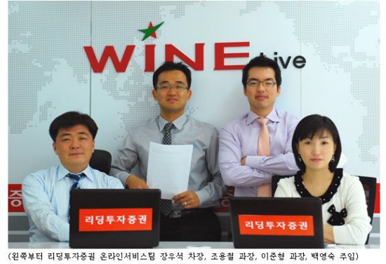 한편, 23일(토), 30일(토) 오후 1시 ‘리딩와인 라이브’ 오픈을 기념해, 방송 출연자가 직접 설명하는 강연회를 개최한다. 특강은 ‘리딩와인 라이브’ 활용 방법 및 미국·중국 주식시장에 대한 투자 전략을 주제로 리딩투자증권 본사 3층(학동역 10번 출구)에서 실시된다. 접수는 선착순 20명이며, 참가를 원하는 경우 이메일(chkim1@leading.co.kr)로 성명과 연락처를 보내면 된다.